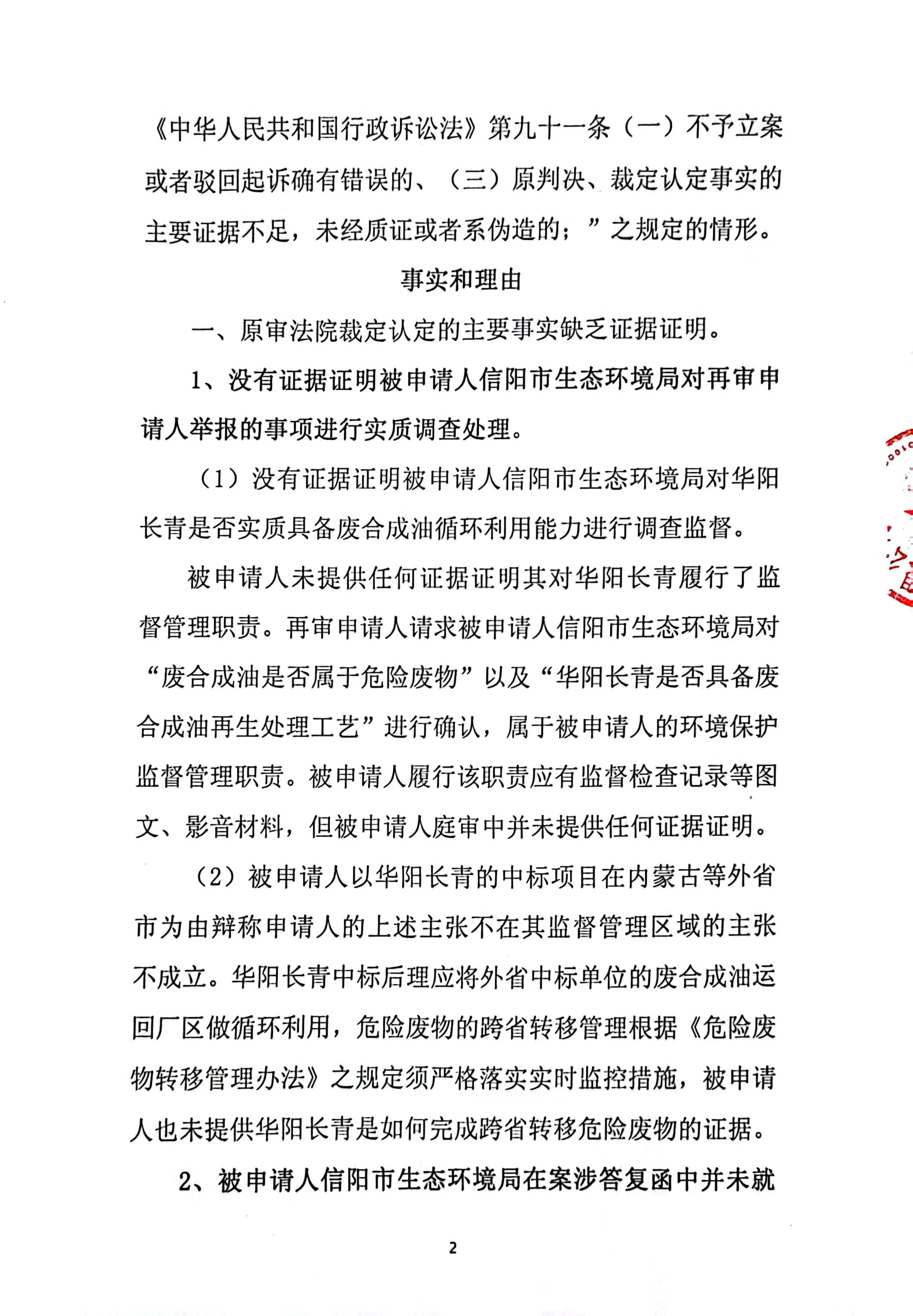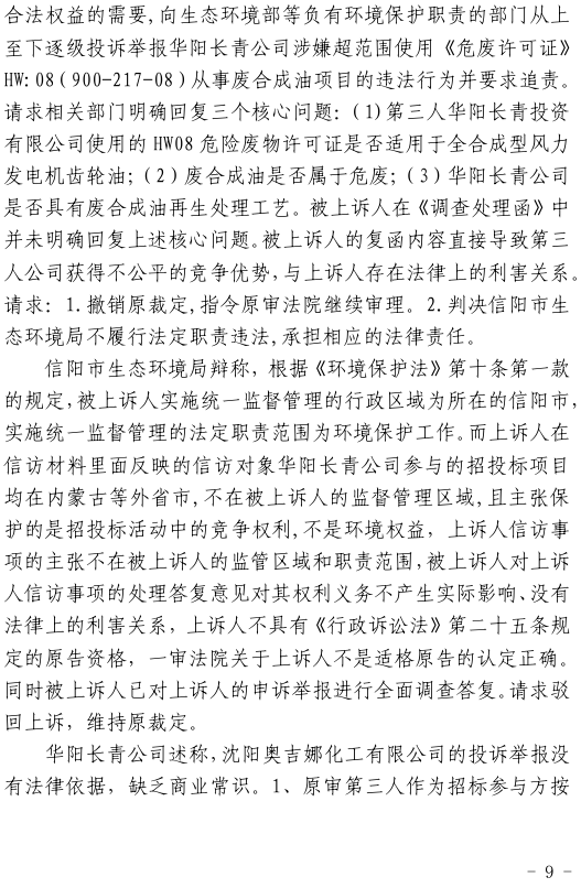 2、一審訴訟請求:請求人民法院判決撤銷被告作出的《信陽市生態(tài)環(huán)境局關于沈陽奧吉娜化工有限公司舉報華陽長青投資有限公司違法經(jīng)營及固始分局不作為、亂作為等問題調(diào)查處理的函》;責令被告對原告向被告舉報華陽長青投資有限公司事項,限期進行重新調(diào)查和答復;判令被告認定的廢合成油不應按危險廢物有關規(guī)定進行管理違反法律規(guī)章規(guī)定,無效。