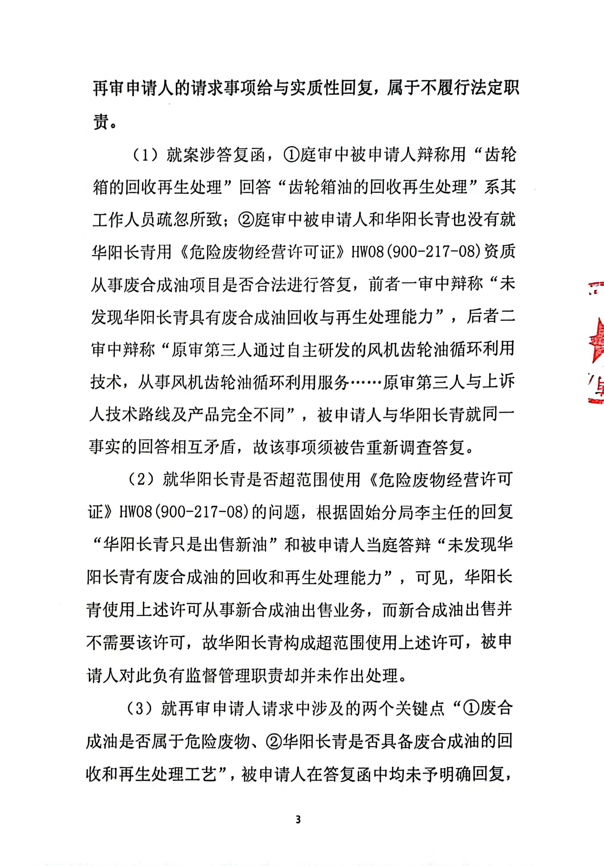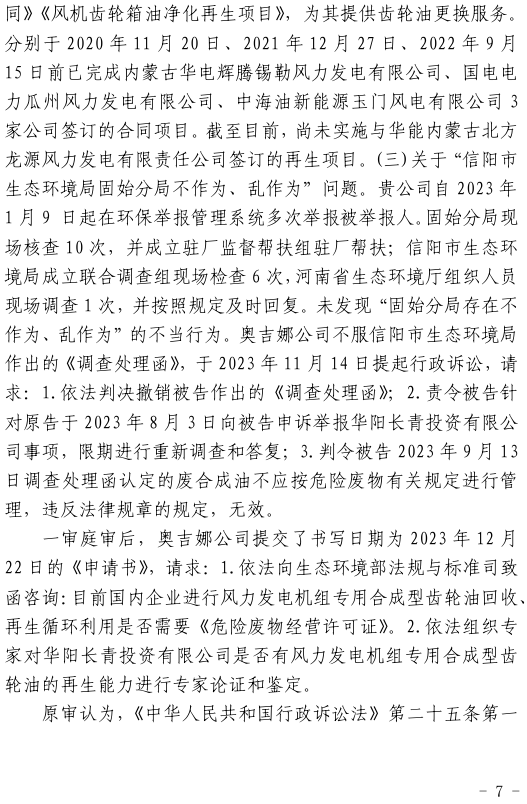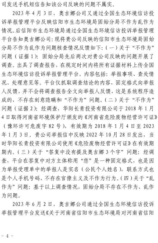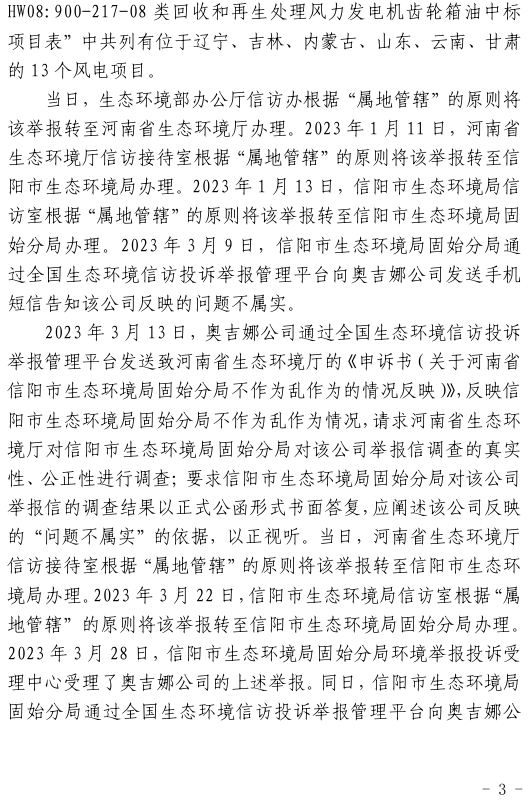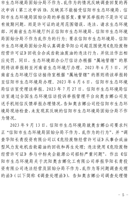 2023年3月9日,奧吉娜公司收到固始分局通過12369環(huán)境信訪平臺的短信答復:“反映問題不屬實”。3月10日,奧吉娜公司向固始分局負責人電話詢問,其解釋稱:經(jīng)調(diào)查核實,華陽長青公司沒有再生風電潤滑油銷售,出售的是新油。否定了奧吉娜公司的舉報內(nèi)容。對此,奧吉娜公司表示強烈不滿。3月11日,奧吉娜公司向環(huán)境部投訴固始分局的不作為和亂作為。2023年5月26日,奧吉娜公司收到12369環(huán)境信訪平臺的短信答復。答復部門為信陽環(huán)境局。令人啼笑皆非的是,答復稱,華陽長青的許可證有效期沒有問題,與舉報內(nèi)容風馬牛不相及。2023年6月13日,奧吉娜公司再次向環(huán)境部提出申訴,指出,奧吉娜舉報的不是許可證有效期問題,而是許可證的適用范圍錯誤、違法。2023年7月27日,奧吉娜公司收到回復稱,經(jīng)信陽市生態(tài)環(huán)境局現(xiàn)場檢查,未發(fā)現(xiàn)固始分局不作為情況。2023年8月3日,奧吉娜公司向河南省生態(tài)環(huán)境廳(以下稱:環(huán)境廳)舉報信陽環(huán)境局包庇固始分局的行為。環(huán)境廳對此高度重視,有關處長和奧吉娜公司負責人進行了面談。2023年9月13日,信陽環(huán)境局向奧吉娜公司致《信陽市生態(tài)環(huán)境局關于沈陽奧吉娜化工有限公司舉報華陽長青投資有限公司違法經(jīng)營及固始分局不作為、亂作為等問題調(diào)查處理的函》。函中:一是,以“齒輪箱”替換“齒輪箱油”,偷換概念;二是,做出了廢風電合成(齒輪)油不屬于危險廢物的結(jié)論;三是,未發(fā)現(xiàn)固始分局存在不作為、亂作為的不當行為。再次否定奧吉娜公司的舉報和投訴。