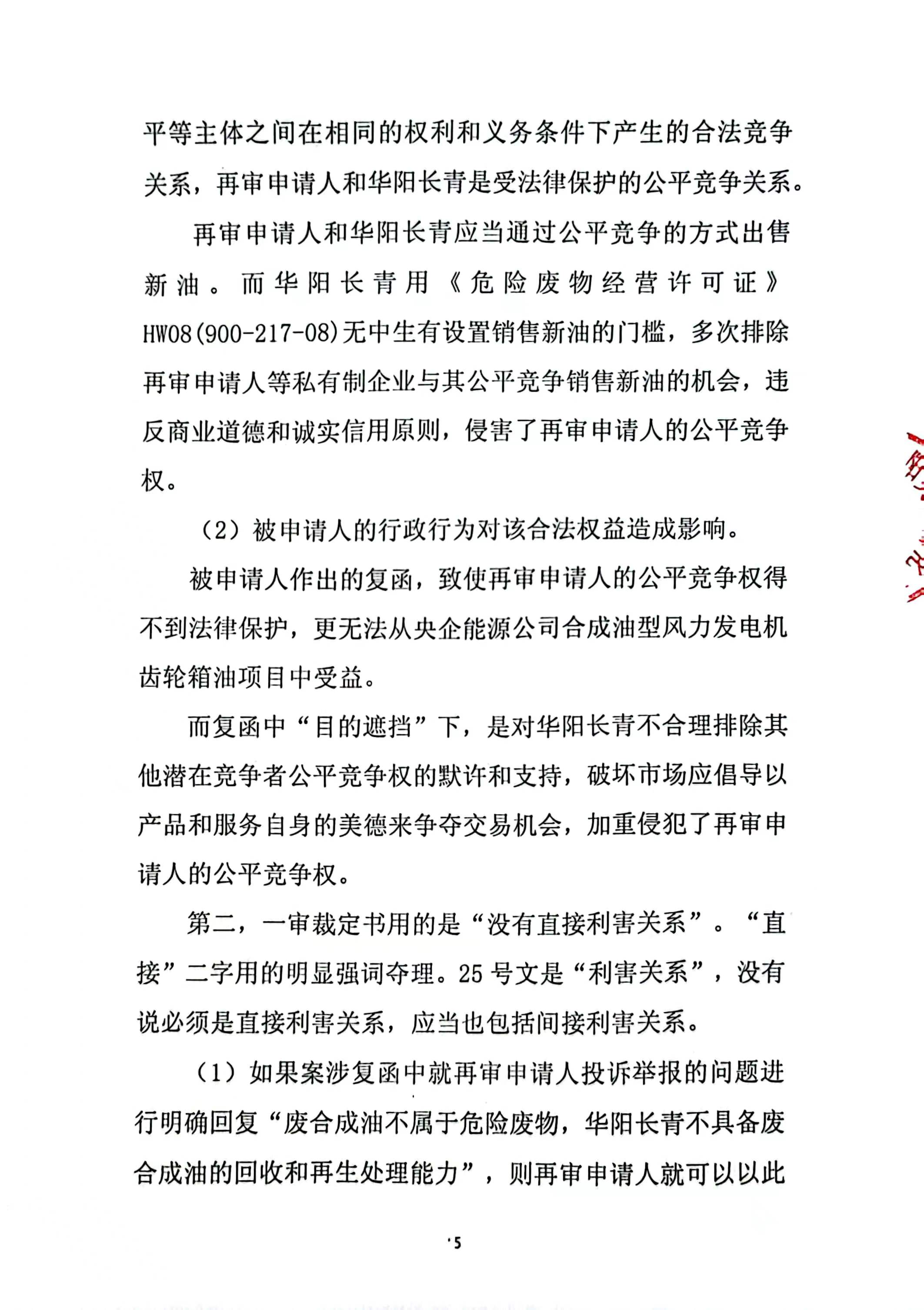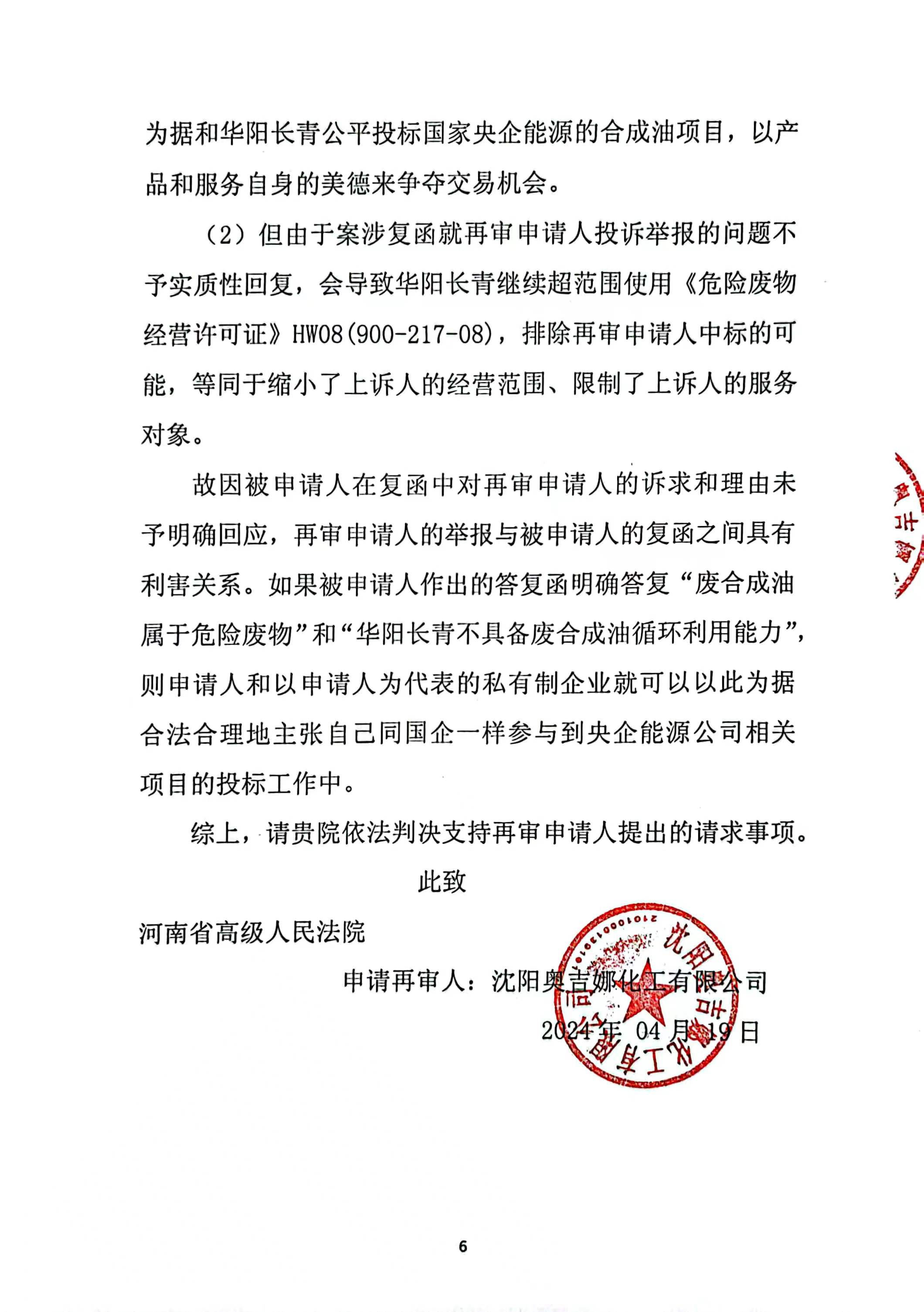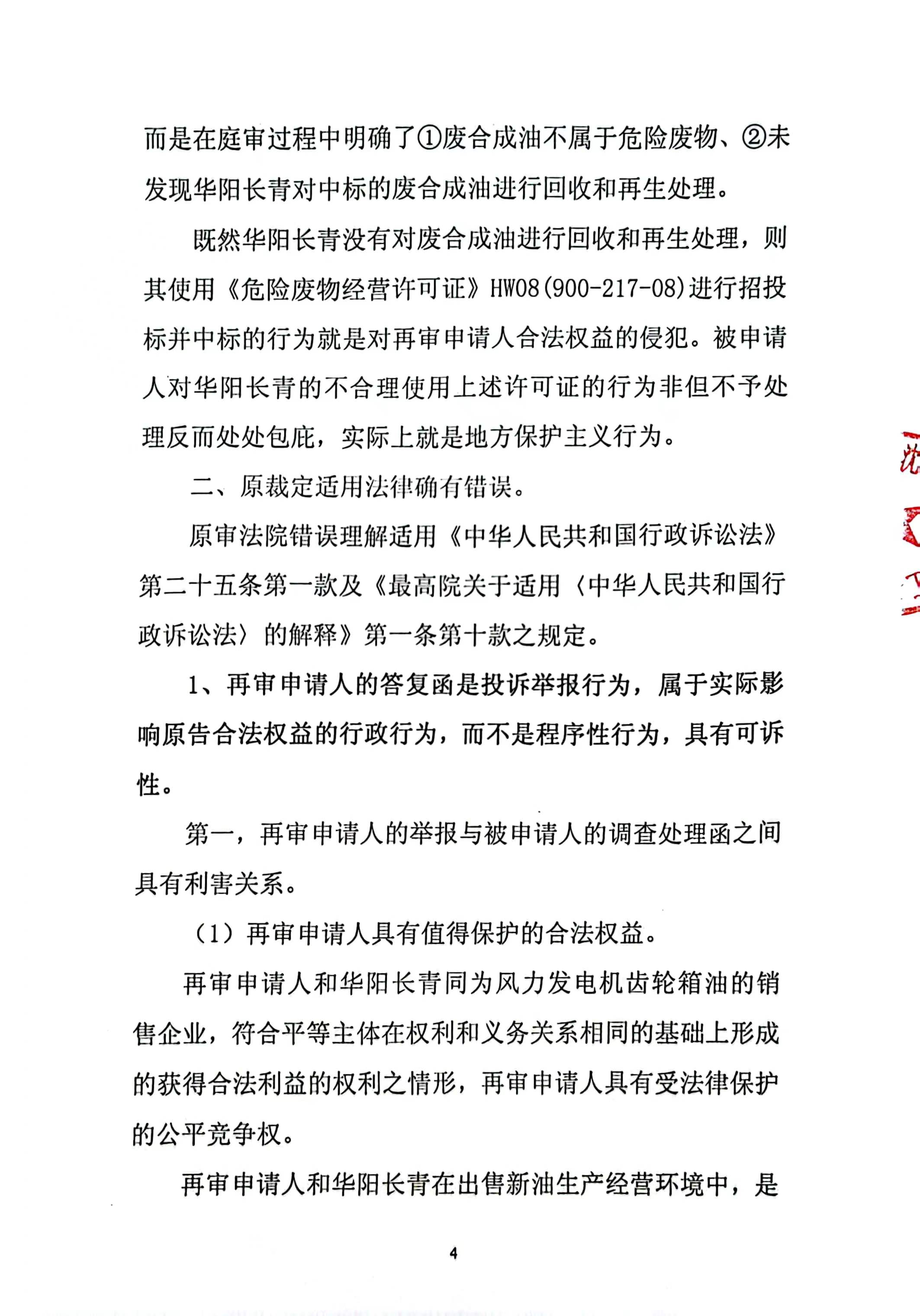 2023年3月9日,奧吉娜公司收到固始分局通過12369環(huán)境信訪平臺的短信答復:“反映問題不屬實”。3月10日,奧吉娜公司向固始分局負責人電話詢問,其解釋稱:經(jīng)調(diào)查核實,華陽長青公司沒有再生風電潤滑油銷售,出售的是新油。否定了奧吉娜公司的舉報內(nèi)容。對此,奧吉娜公司表示強烈不滿。3月11日,奧吉娜公司向環(huán)境部投訴固始分局的不作為和亂作為。2023年5月26日,奧吉娜公司收到12369環(huán)境信訪平臺的短信答復。答復部門為信陽環(huán)境局。令人啼笑皆非的是,答復稱,華陽長青的許可證有效期沒有問題,與舉報內(nèi)容風馬牛不相及。2023年6月13日,奧吉娜公司再次向環(huán)境部提出申訴,指出,奧吉娜舉報的不是許可證有效期問題,而是許可證的適用范圍錯誤、違法。2023年7月27日,奧吉娜公司收到回復稱,經(jīng)信陽市生態(tài)環(huán)境局現(xiàn)場檢查,未發(fā)現(xiàn)固始分局不作為情況。2023年8月3日,奧吉娜公司向河南省生態(tài)環(huán)境廳(以下稱:環(huán)境廳)舉報信陽環(huán)境局包庇固始分局的行為。環(huán)境廳對此高度重視,有關處長和奧吉娜公司負責人進行了面談。2023年9月13日,信陽環(huán)境局向奧吉娜公司致《信陽市生態(tài)環(huán)境局關于沈陽奧吉娜化工有限公司舉報華陽長青投資有限公司違法經(jīng)營及固始分局不作為、亂作為等問題調(diào)查處理的函》。函中:一是,以“齒輪箱”替換“齒輪箱油”,偷換概念;二是,做出了廢風電合成(齒輪)油不屬于危險廢物的結(jié)論;三是,未發(fā)現(xiàn)固始分局存在不作為、亂作為的不當行為。再次否定奧吉娜公司的舉報和投訴。