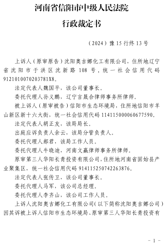 1、原告:沈陽奧吉娜化工有限公司,被告:信陽市環(huán)境局,第三人:華陽長青投資有限公司。