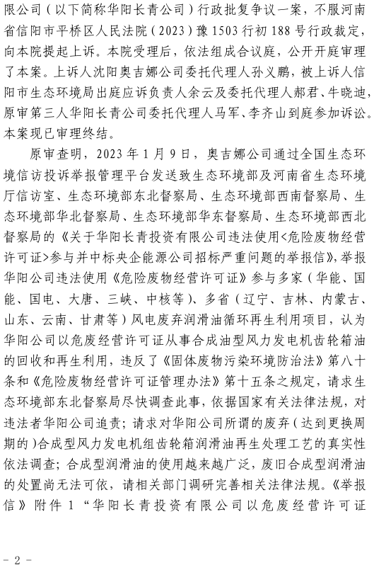 中國風電潤滑油民營企業(yè)沈陽奧吉娜化工有限公司(下簡稱:奧吉娜公司或上訴人)訴信陽市生態(tài)環(huán)境局(被上訴人)和第三人華陽長青投資有限公司(下簡稱:華陽長青公司)行政訴訟案,河南省信陽市中級人民法院于2024年4月2日作出二審行政裁定:駁回上訴,維護原裁定。