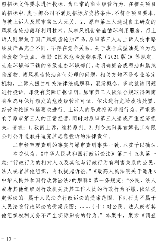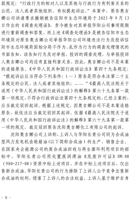 2023年10月18日,奧吉娜公司依據(jù)《行政訴訟法》和《行政訴訟法解釋》,將信陽市環(huán)境局和第三人華陽長青公司訴至信陽市平橋區(qū)人民法院,請求法院:1、判決撤銷被告作出的《信陽市生態(tài)環(huán)境局關于沈陽奧吉娜化工有限公司舉報華陽長青投資有限公司違法經(jīng)營及固始分局不作為、亂作為等問題調(diào)查處理的函》;2、責令被告針對原告于2023年8月3日向被告申訴舉報華陽長青投資有限公司事項,限期進行重新調(diào)查和答復;3、請求人民法院判令被告2023年9月13日調(diào)查處理函認定的廢合成油不應按危險廢物有關規(guī)定進行管理,違反法律規(guī)章的規(guī)定,無效。